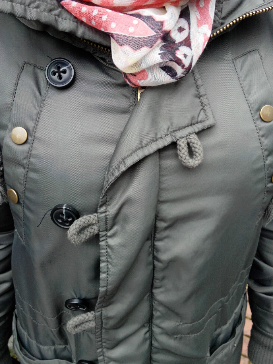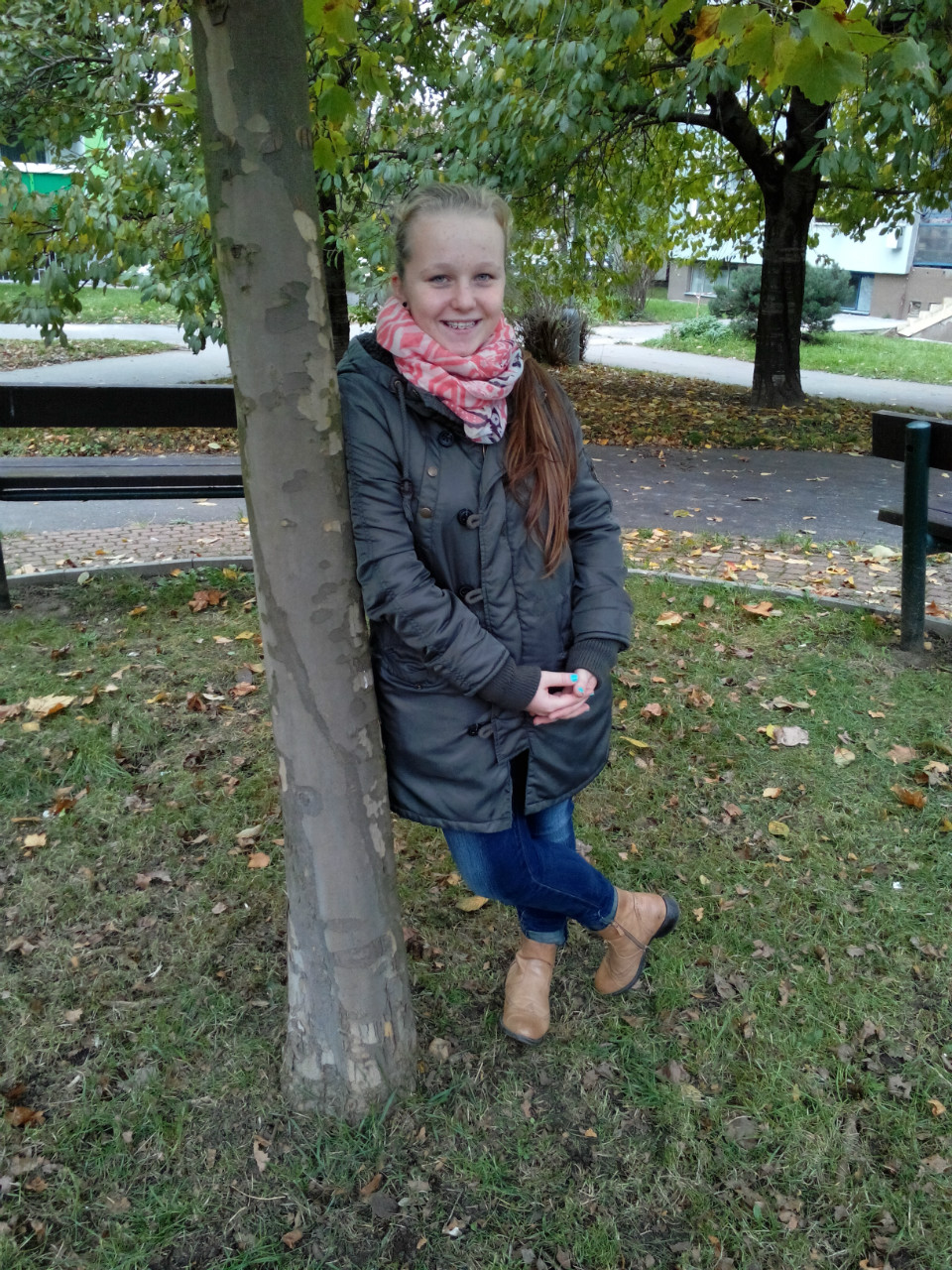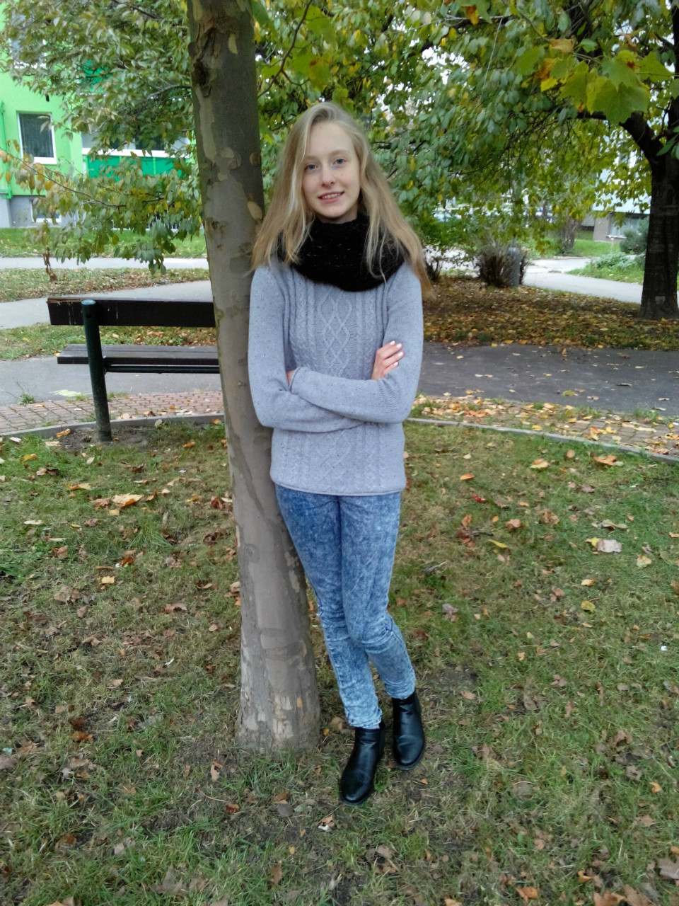 Kristýna má na sobě plísňové džíny, a protože už je venku i ve škole čím dál tím větší zima, tak si k tomu vzala šedivý svetr a šálu. Jako boty zvolila pérka. Ty jsou poslední dobou hodně v módě a hodí se k spoustě věcí, takže si myslím, že se unosej.